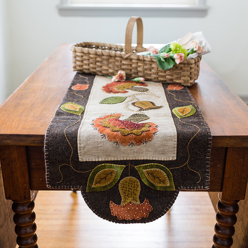 I can't tell you how many designs Rebekah has created that take inspiration from sunflowers. They are certainly one of her favorites. These three pieces are currently on the workshop list, which means she teaches them in her travels (no patterns available outside workshops yet). The table mat, pictured on the seat of the chair, was originally designed for a dye workshop held with Donna Bennett of Crows on the Ledge. The students would dye their wool on day one, and then stitch with it on day two. The sewing caddies began as a finished piece which Rebekah sold early on. We had so many requests for that one, that she decided to make a variation of it as a class project. And who wouldn't want a little sunshine to add to their home?